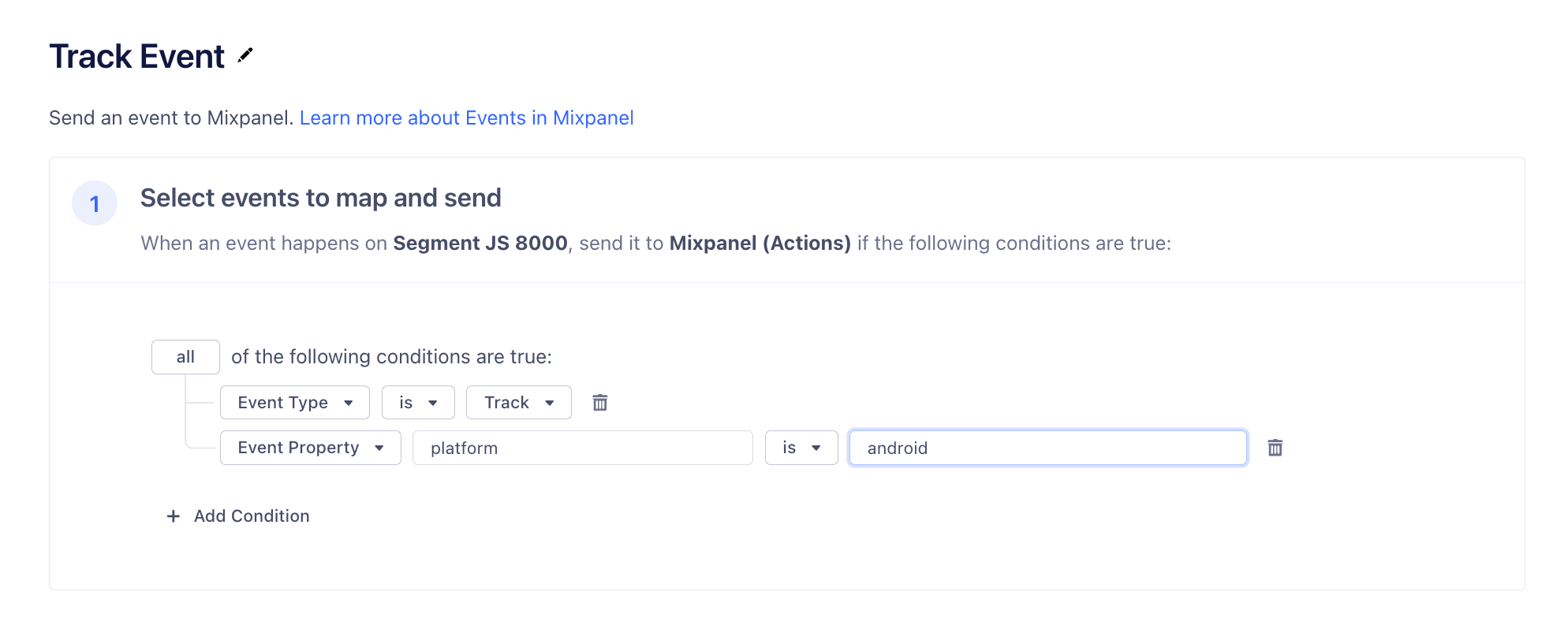 Let’s say you want to create a mapping that is triggered for any events tracked on Android. In this case, we can set the condition to Event Type equal Track and Event Property platform equal android:
